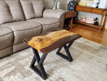 18 in End table built with Black Walnut wood and Black mica rein. 3 gold metal legs.