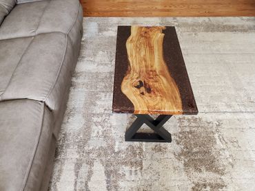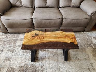 16 by 30 in Coffee table built with Olive wood and coffee beans inserted into resin.  Black metal legs